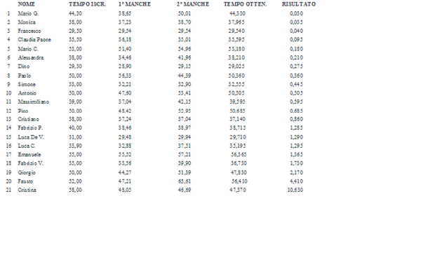 I risultati sono stati comunque stupefacenti per tutti considerato che i primi tre - Supermario, Monica e il Capitano - sono raggruppati in un solo centesimo (!!!) e che i primi 13 hanno sbagliato per meno di un secondo!!